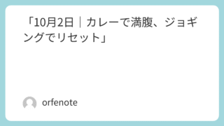 マラソン挑戦 「10月2日|カレーで満腹、ジョギングでリセット」 ⸻今日は朝からしっかり食べてスタート。目玉焼き、ウインナー、チキンナゲットにご飯300g、チーズ、トマトも取り入れてバランスよく。昼は野菜生活180mlとプロテイン+低脂肪乳で軽めに調整。夜はカレーとご飯に缶チューハイを合わせ、満足度の高い... 2025.10.03 マラソン挑戦