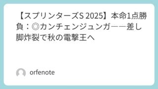 🐴 重賞データ分析 【スプリンターズS 2025】本命1点勝負:◎カンチェンジュンガ――差し脚炸裂で秋の電撃王へ 導入秋の短距離王決定戦・スプリンターズステークス。過去データが語る「勝ちパターン」に、今年もしっかりハマる1頭がいます。本命1点勝負は◎カンチェンジュンガ。 単勝・複勝の一本釣りで狙います。⸻予想結論 • ◎5 カンチェンジュンガ(牡5・坂... 2025.09.28 🐴 重賞データ分析